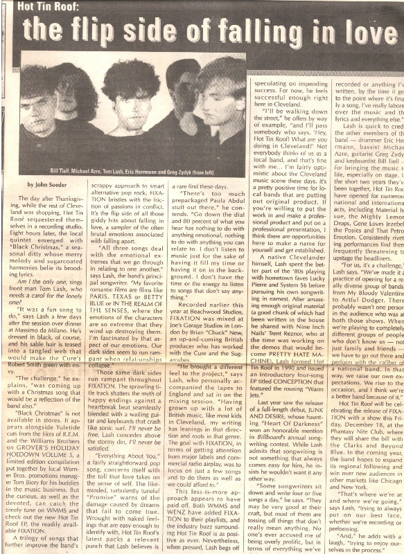 This less-is-more approach appears to have paid off. Both WMMS and WENZ have added FIXATION to their playlists, and the industry buzz surrounding Hot Tin Roof is as positive as ever. Nevertheless when pressed, Lash begs off speculating on impending success. For now, he feels successful enough right here in Cleveland.