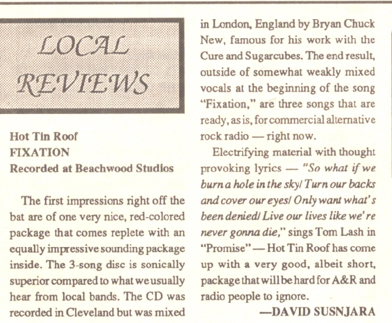 The first impression right off the bat are of one very nice, red-colored package that comes replete with an equally impressive sounding package inside. the 3-song disc is sonically superior compared to what we usually hear from local bands. The CD was recorded in Cleveland but was mixed in London, England by Bryan Chuck New, famous for his work with the Cure and Sugarcubes. The end result, outside of somewhat weakly mixed vocals at the beginning of the song "Fixation," are three songs that are ready, as is, for commercial alternative rock radio - right now.