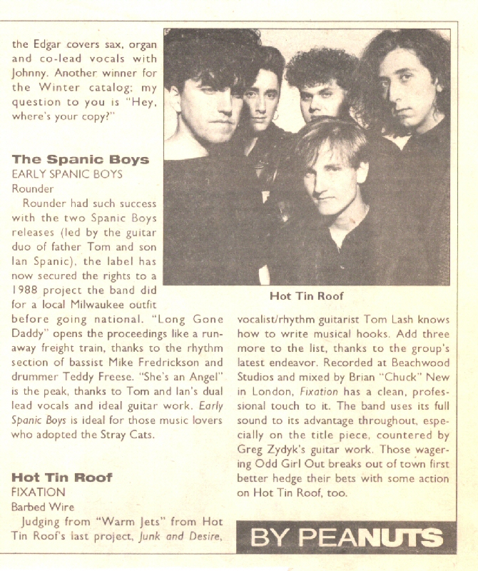Judging from "Warm jets" from Hot Tin Roof's last project, Junk And Desire, vocalist/rhythm guitarist Tom Lash knows how to write musical hooks. Add three more to that list, thanks to the groups latest endeavor. Recorded at Beachwood Studios and mixed by Brian "Chuck" new in London, Fixation has a clean, professional touch to it. The band uses its full sound to its advantage throughout, especially on the title piece, countered by Greg Zydyk;'s guitar work. Those wagering Odd Girl Out breaks out of town first better hedge their bets with some action on Hot Tin Roof, too.
