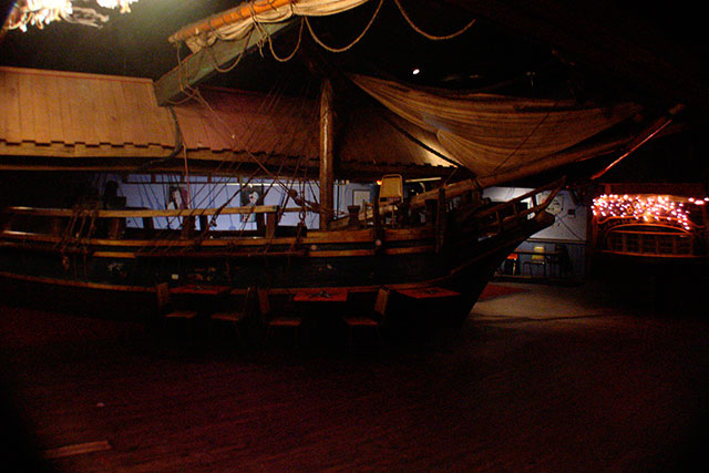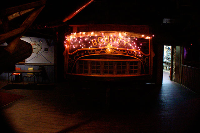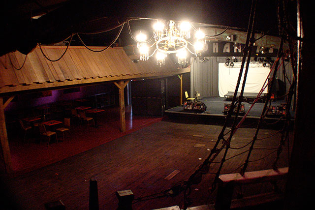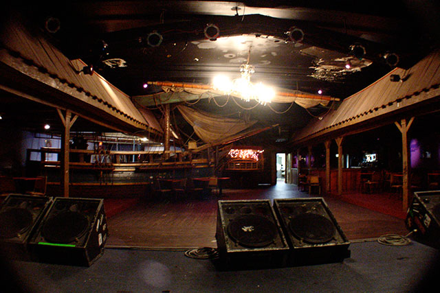 Walking between the halves of the ship, you come into the main Nite Club floor. The seating areas are made to look like island shelters, which naturally goes perfectly with the ship. Smack in the middle of the ceiling is a giant, bright, chandelier, which had been yanked off kilter in a rather piratical fashion due to a recent wrestling match that had been held in the club (that must have been an interesting night for club hoppers!). The stage, unfortunately, was bare as it was not set up for any acts that would be playing there, but it still had that magic feeling. Naturally, we had to jump up on it and stand in the same place that Lucky Pierre played most of their shows.