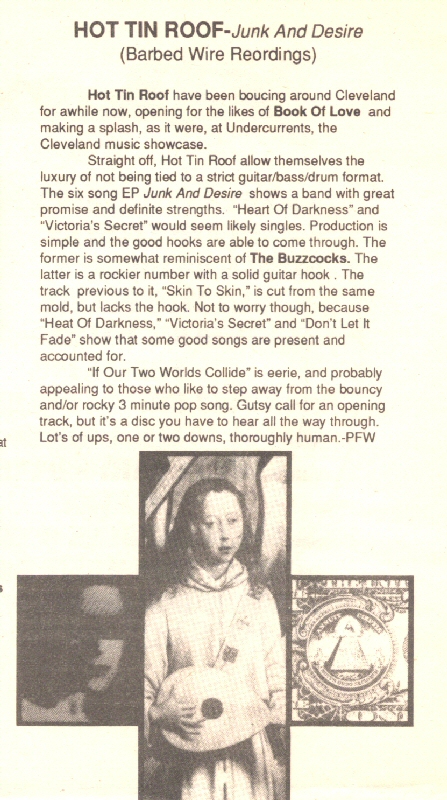 Straight off, Hot Tin Roof allow themselves the luxury of not being tied to a strict guitar/bass/drum format. The six song EP Junk And Desire shows a band with great promise and definite strengths. "heart Of Darkness" and "Victoria's Secret" would seem likely singles. Production is simple and the good hooks are able to come through. The former is somewhat reminiscent of The Buzzcocks. The latter is a rockier number with a solid guitar hook. The track previous to it, "Skin To Skin," is cut from the same mold, but lacks the hook. Not to worry, though, because "Heart Of Darkness", "Victoria's Secret" and "Don't Let It Fade" show that some good songs are present and accounted for.