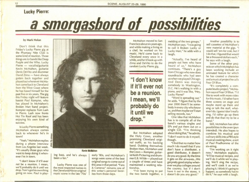 Don't think that this Friday's Lucky Pierre gig at the Phantasy Nite Club is some kind of reunion. Those things are for bands like Deep Purple and The Who. Lucky Pierre - vocalist/guitarist Kevin McMahon, guitarist Denis DeVito and drummer Dave Zima - have always gotten back together and played out whenever McMahon came back to Cleveland from the West Coast where he has based himself for the past five or six years. The gig this Friday night will feature bassist Paul Kompier, who has played in McMahon's Broken Man band project. Kompier replaces Tom Lash in Pierre. Lash Now fronts Hot Tin Roof and Has been enjoying his own kind of success.
