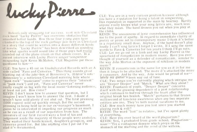 Relentlessly struggling for success, west side Cleveland rock band Lucky Pierre has overcome obstacles that smashed better bands. How these four young guys climbed to the top of the rock garbage pile here in Cleveland is a story that could be written into a dozen different kinds of novels. Lucky Pierre has been described as sounding like what Sparks would sound like if those guys had really crawled out of the plane crash on that album cover. In a recent interview with Lucky Pierre singer-songwriter misguiding light Kevin McMahon, CLE magazine put these questions to him.