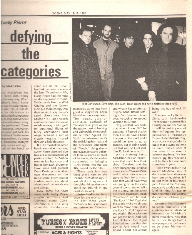 The new Lucky Pierre - Zima, Lash, keyboardist Trent Reznor, guitarist Rick Christyson and McMahon - will be making on of their infrequent live appearances at Peabody's Down Under this Saturday, May 14. McMahon's thinking is that playing out two or three times a week at the same clubs doesn't achieve anything. the Peabody's gig this weekend will be their last one until sometime in June.
