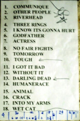 We went back to the bar area and saw Andy K He was talking to libido. Crestfallen seemed a little nervous and tr67 and I had to nudge her on. We talked to him just for a few seconds and when he signed my copy of the set list (his) he pointed out that the ones marked with arrows (tough and darling dead) were the ones that they were going to cut since Kevin wasn't feeling to well and that the notes at the bottom were for a new song that they didn't play.