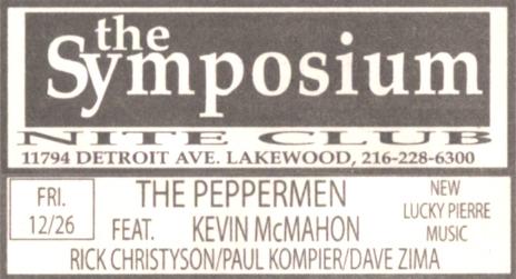 You can't visit the corner of W.117th & Detroit on the Lakewood/Cleveland border and just visit one club. So while Fusion, the opening band for The Peppermen, gave the Symposium's sound system a good workout (playing an "acoustic" song means replacing one of their electric guitars with an acoustic, but the volume level stays loud, as usual), we wandered across the street to the Hi-Fi Club to check on the Headbanger's Ball, featuring the band Bright Blue Chicken Feathers.